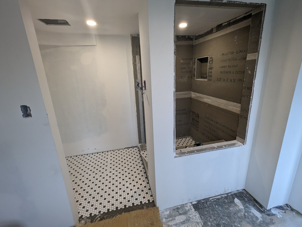Now, we’re on to choosing a vanity countertop and mirrors, with fixtures to be installed shortly. I’m thinking maybe a marble look for the countertop? I think that would go nicely with the black and white floor and the (yes, we went for it) pink tiles in the shower. I really wanted gold fixtures for the sink and shower, but alas, they are SO MUCH MORE expensive than chrome or nickel. Choices, choices. No matter what we do, I know it will look and function better than it did before. And I also realized earlier this week that I have no “before” pictures of this bathroom. You’ll just have to trust me that it was…less than perfect. (Read: It felt an awful lot like a dark, damp, small hole in the wall with just the bare basics. I hated it. I was embarrassed when people had to use it.)